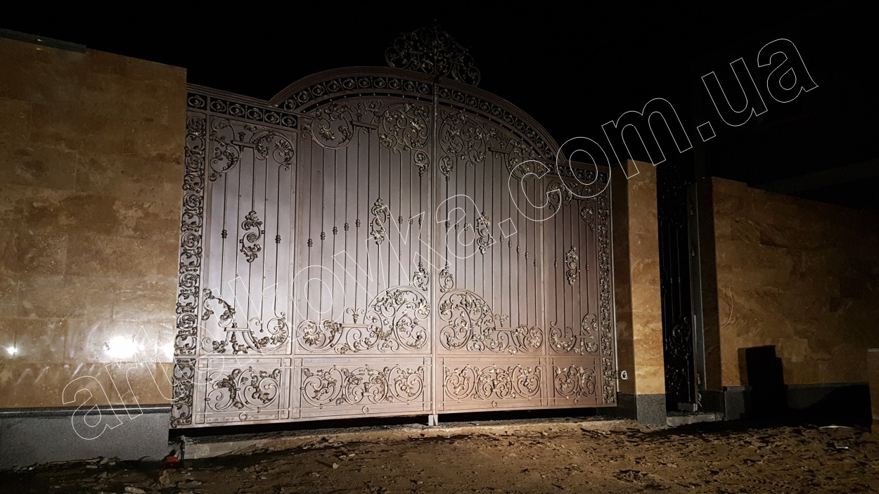 Все началось с проектирования, изготовления и монтажа кованых распашных ворот и автоматики. Ворота на данном объекте внушительных размеров 5х3,5 метра. Автоматика Came Ferni для створок весом до 800 кг. и шириной до 4-х метров. Для габаритов данных ворот этот привод подходит идеально. При выборе автоматики необходимо учитывать вес, габариты ворот и другие нагрузки которые будут возникать в процессе эксплуатации. Ворота имеют не малый вес, зашиты стальным оцинкованным листом. При производстве данных ворот были применены различные сечения начиная от профильных труб, заканчивая монолитным квадратом. Все стыки, поднутрения и места сварки обработаны цинксодержащим составом. Ворота окрашены темно-коричневой краской с металлической стружкой. На воротах применено патинирование в 3 этапа. На калитке установлен электро-механический замок. Общий вид ворот дополняют кованые стильные фонари, которые подчеркивают общую архитектуру объекта.