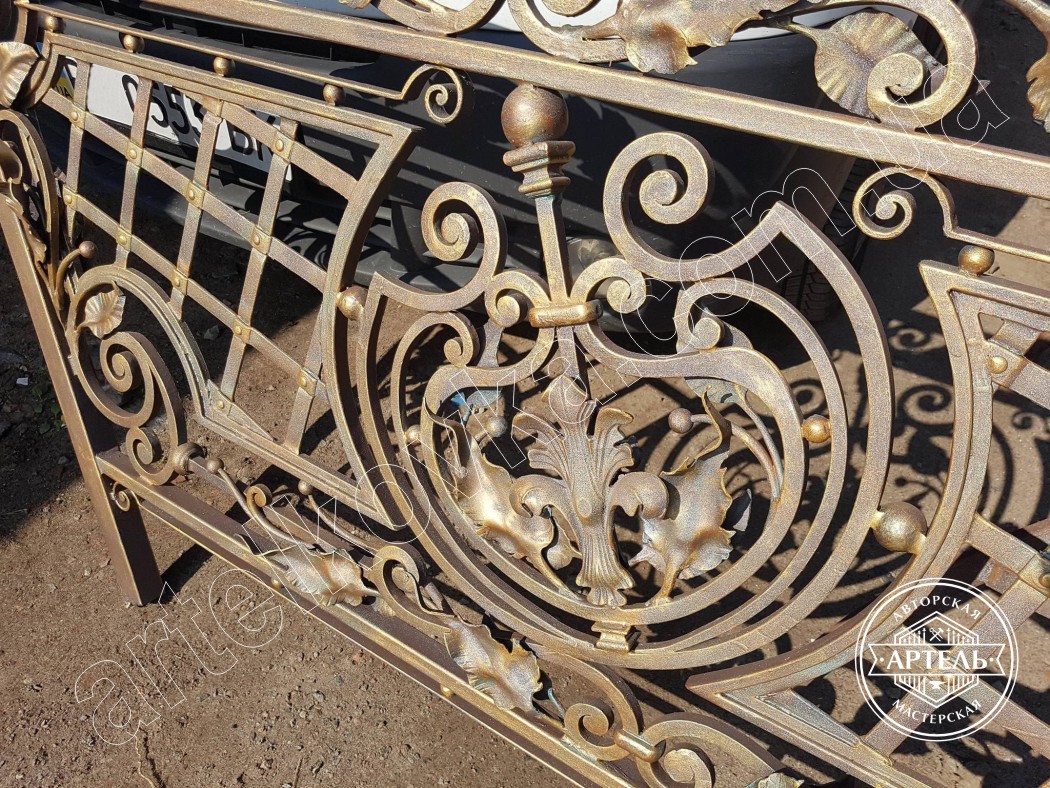 Так же на объекте были установлены кованые перила. Заказать кованые перила заказчик захотел после монтажа кованых ворот. Перед изготовлением был долгий этап проектирования и согласования кованых перил. Наши дизайнеры предлагали различные варианты перил, но заказчик настоял на своем варианте. Мы спроектировали 3d модель, обсудили все размеры, изготовили и установили кованые перила террасы и лестницы. После кузнечных и слесарно-сварочных работ кованые перила были зачищены, поцинкованы и покрашены краской для кованых изделий коричневого цвета. После покраски перил кованые элементы и листья дополнительно были покрыты патиной (зелень, бронза, золото).